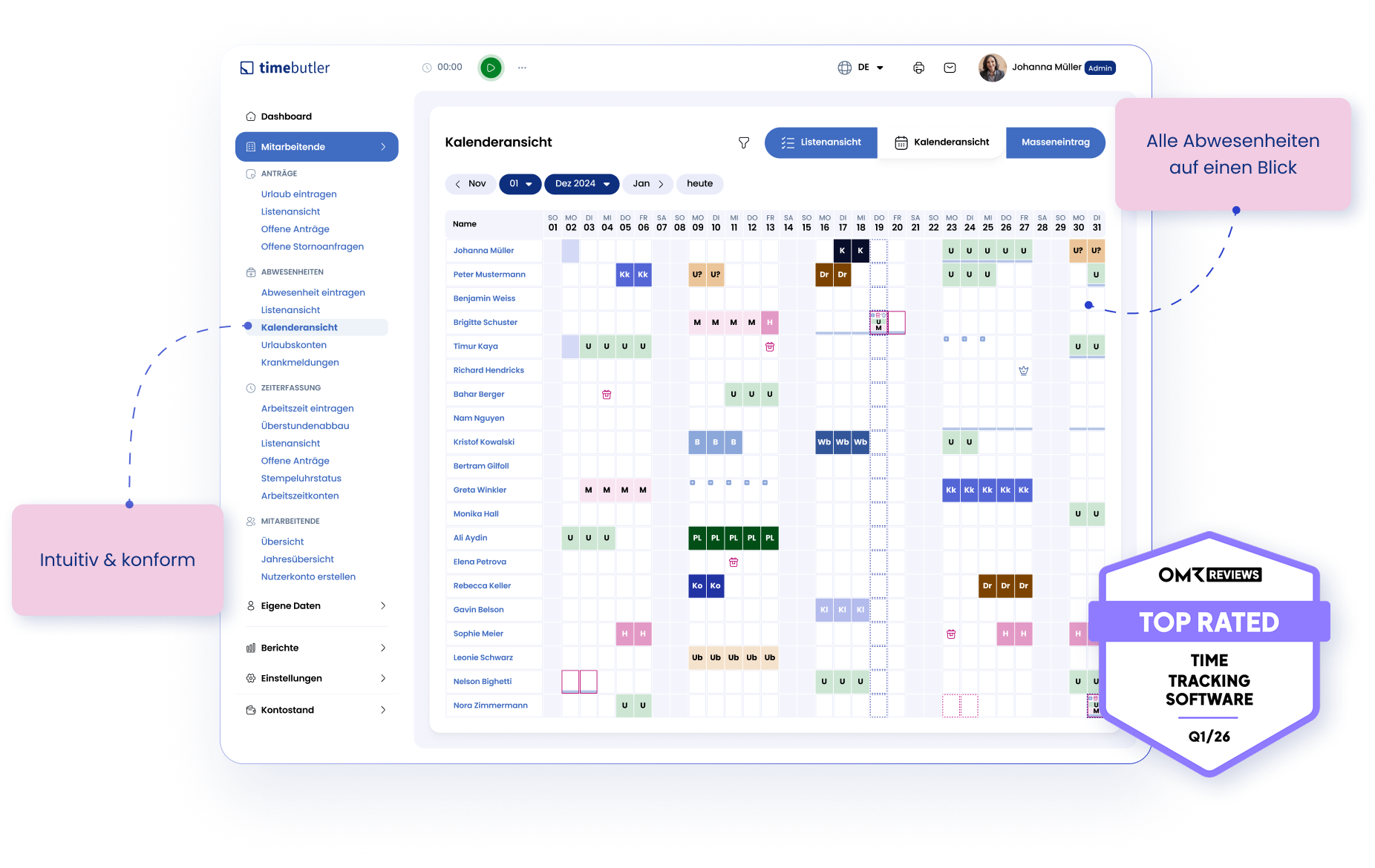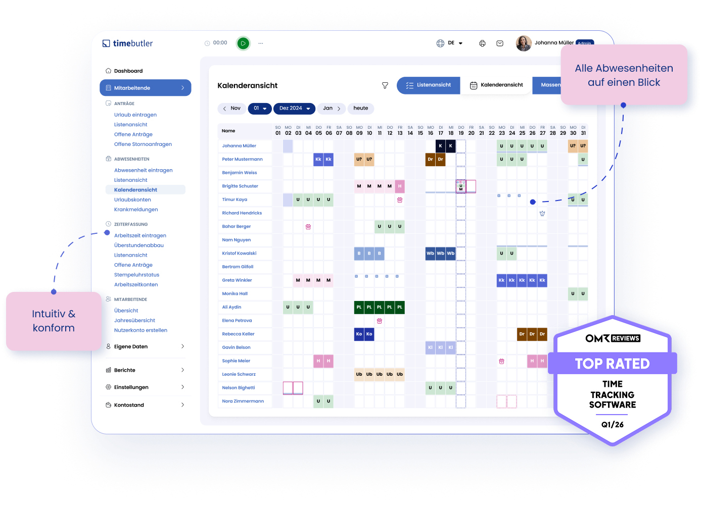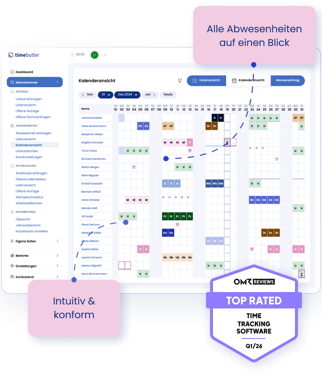 Mit Timebutler organisierst du Arbeitszeiten, Abwesenheiten und Ressourcen so, dass dein Alltag leichter wird und alles dabei gesetzeskonform bleibt.