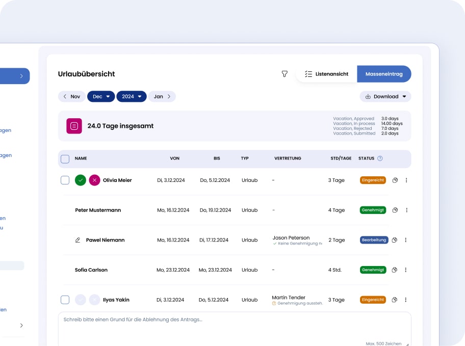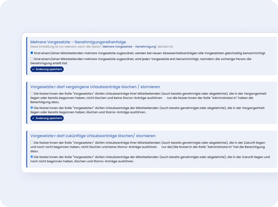Bestimme, ob eine oder mehrere Führungskräfte Abwesenheitsanträge freigeben sollen, und passe den Ablauf individuell an deine Bedürfnisse an. So bleibt dein Abwesenheitsmanagement effizient und übersichtlich.