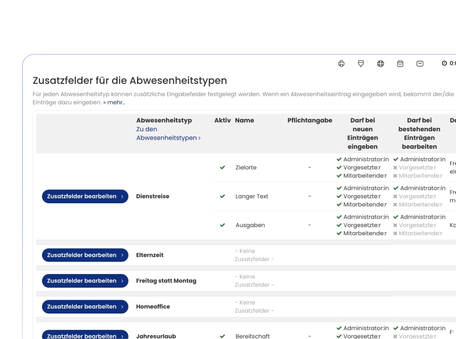 Benötigst du bestimmte Details zu Abwesenheiten? Dann füge einfach Zusatzfelder hinzu, um genau die Informationen zu erfassen, die du brauchst. Zudem kannst du festlegen, wie Mitarbeitende ihre Zeit- und Urlaubsanträge ausfüllen – ob mit Textfeldern, Datumsauswahl, Ja/Nein-Optionen und mehr.