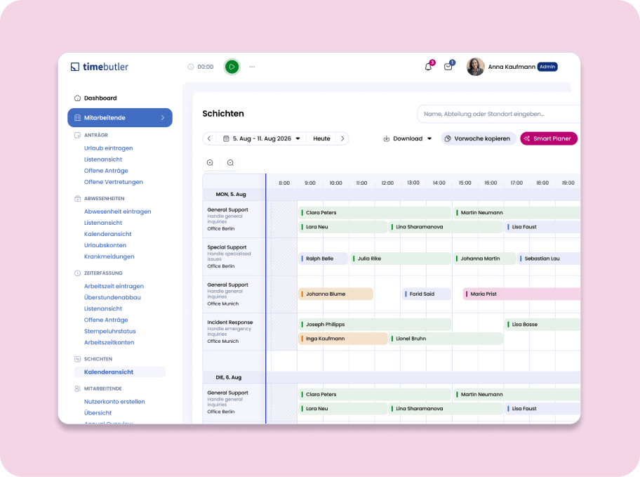 Für alle, die mit Schichten arbeiten – ob Einzelhandel, Pflege, Produktion, Gastronomie oder hybride Büro-Teams. Überall dort, wo ein klarer, verlässlicher Dienstplan gefragt ist, hilft Timebutler dabei, die Planung einfacher und übersichtlicher zu machen. Und das ohne kompliziertes Setup oder stundenlange Einarbeitung.