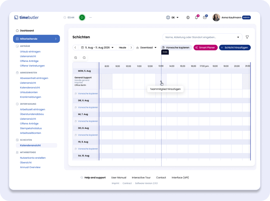 Du öffnest Timebutler und siehst auf einen Blick: Wer arbeitet wann? Welche Schichten sind bereits besetzt? Wo gibt es noch Lücken? Der Wochenkalender zeigt dir alles, was du brauchst – übersichtlich, ohne langes Suchen, ohne Hin- und Herklicken. Blättere einfach zwischen Wochen vor und zurück – ob für die aktuelle Planung oder den Rückblick auf vergangene Wochen. So hast du jederzeit den vollen Überblick über den Dienstplan deines Teams, egal von wo du arbeitest.