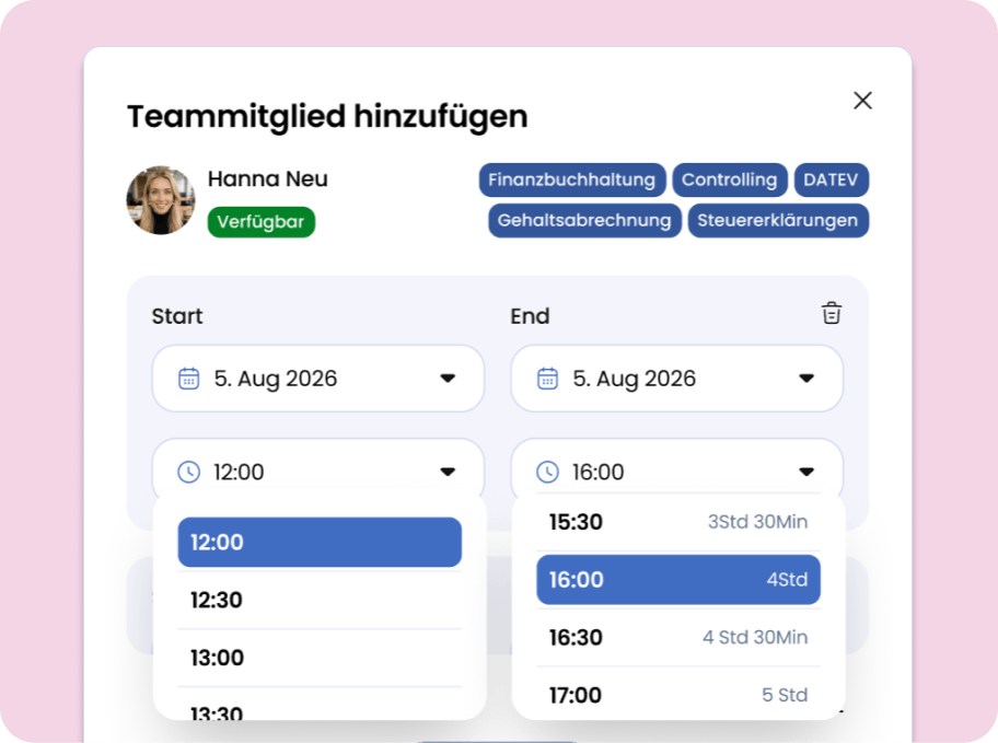 Mitarbeitende auswählen. Die Verfügbarkeitsanzeige zeigt dir sofort, wer eingeplant werden kann. Auch unterschiedliche Zeiten sind problemlos möglich.