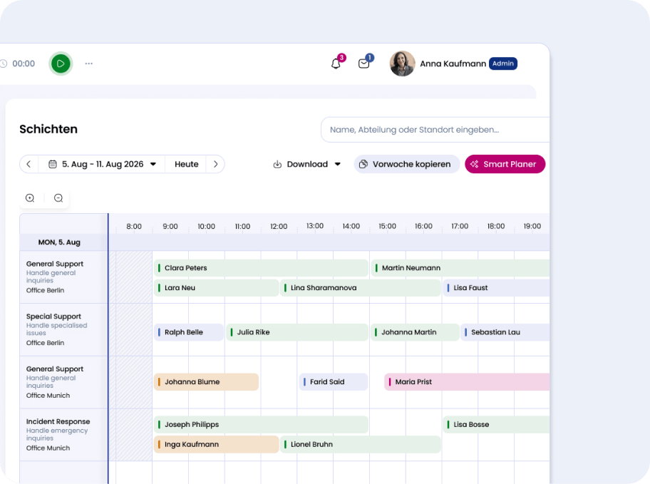 Du kannst die Schichtplanung an Vorgesetzte weitergeben, ohne die Kontrolle zu verlieren. Jede Führungskraft plant ihren eigenen Bereich, sieht und bearbeitet nur die Schichten, die sie betreffen. Als Admin hast du jederzeit das vollständige Bild über das gesamte Unternehmen.