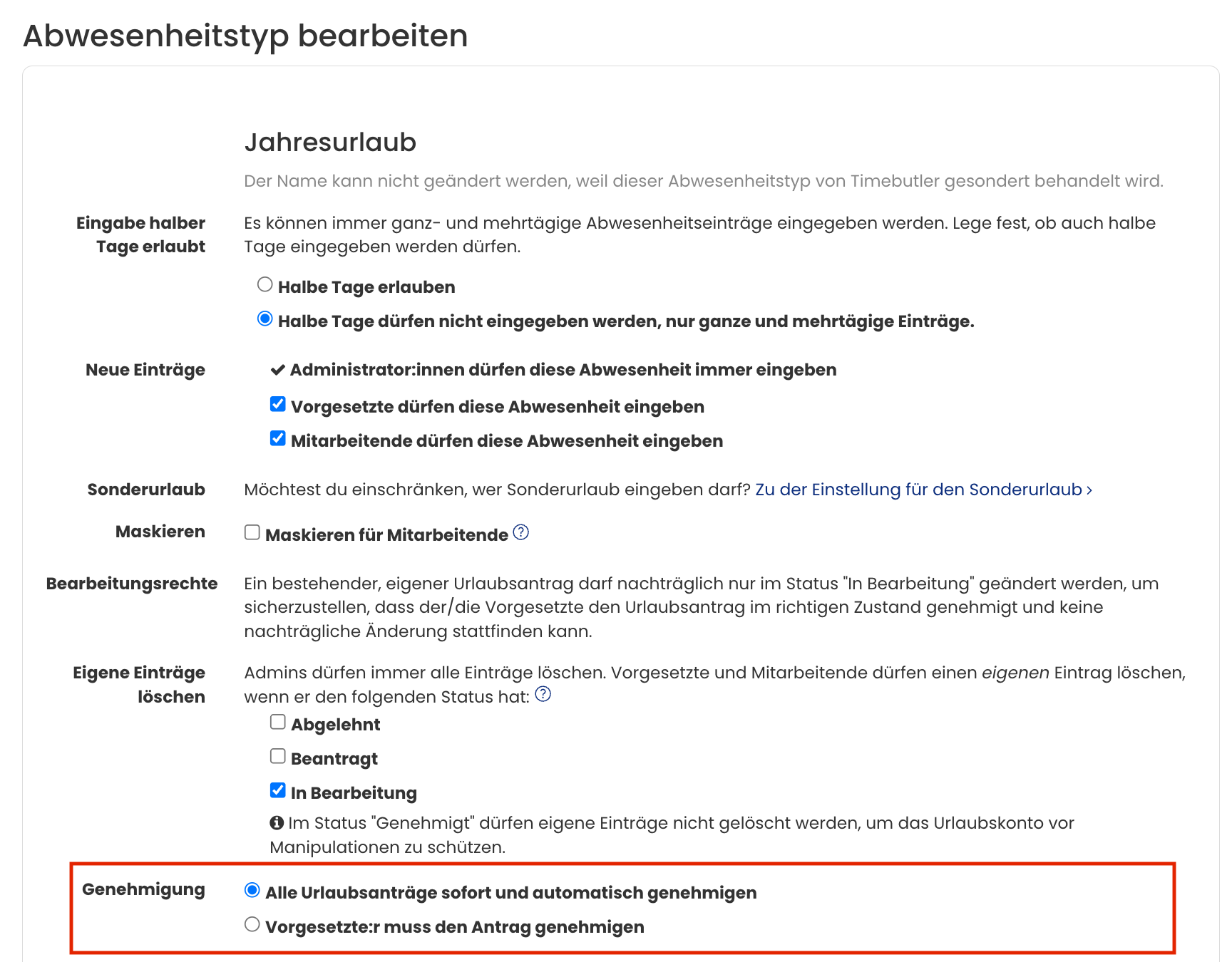 Screenshot: Urlaub als nicht genehmigungspflichtig einstellen