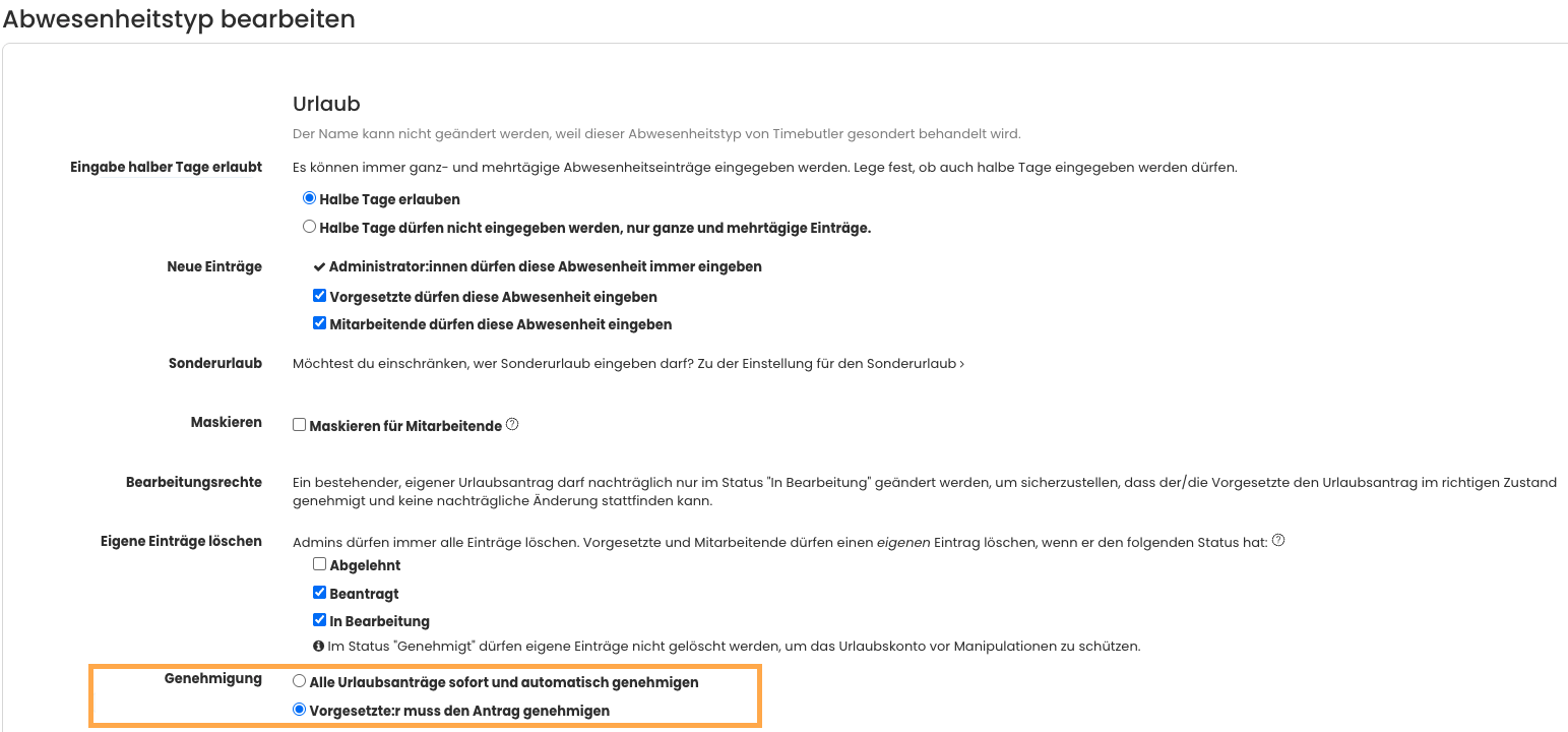 Als Admin kannst du für jeden Abwesenheitstyp (Schulung, Homeoffice, Dienstreise, …) festlegen, ob er genehmigungspflichtig ist oder nicht. Das geht auch für Urlaub.