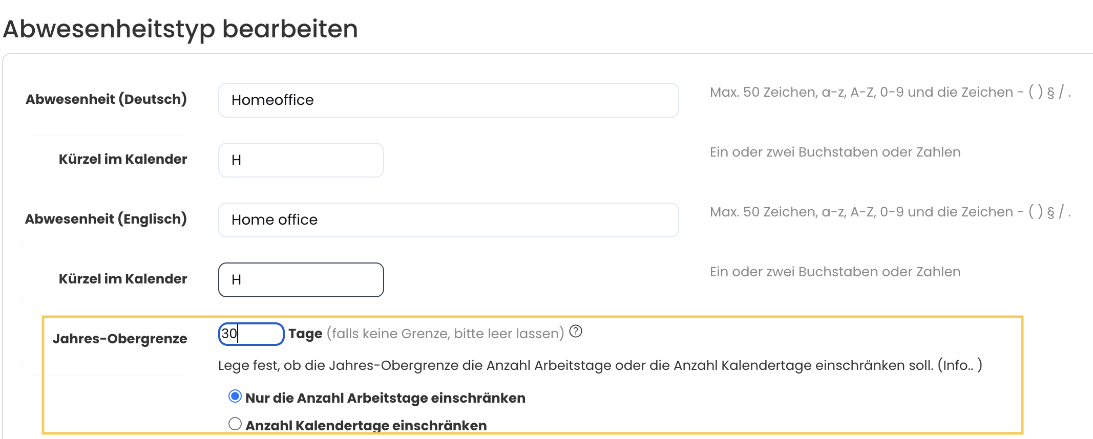 Screenshot: Jahresobergrenze für Abwesenheiten
