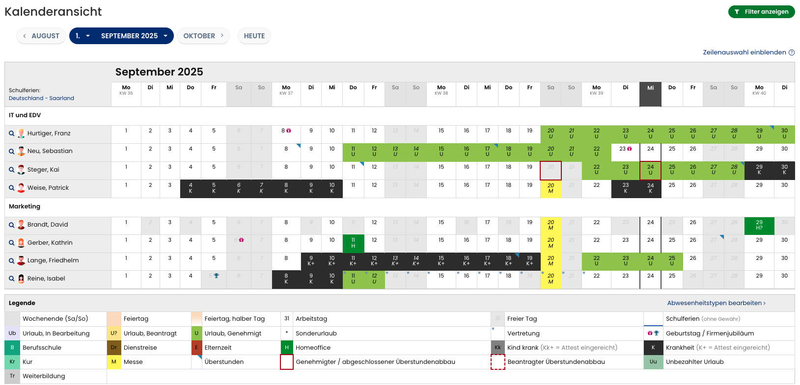 In der Kalenderansicht über Kolleg:innen oder dein Team (für Vorgesetzte und Admins) siehst du Mitarbeitende alphabetisch sortiert.