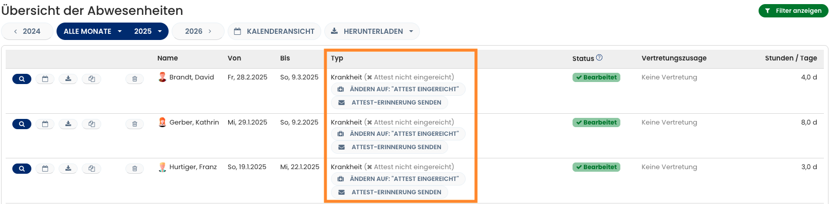 Du kannst in Timebutler bequem Erinnerungs-E-Mails an Mitarbeitende mit Krankheitseinträgen schicken, bei denen das ärztliche Attest fehlt.
