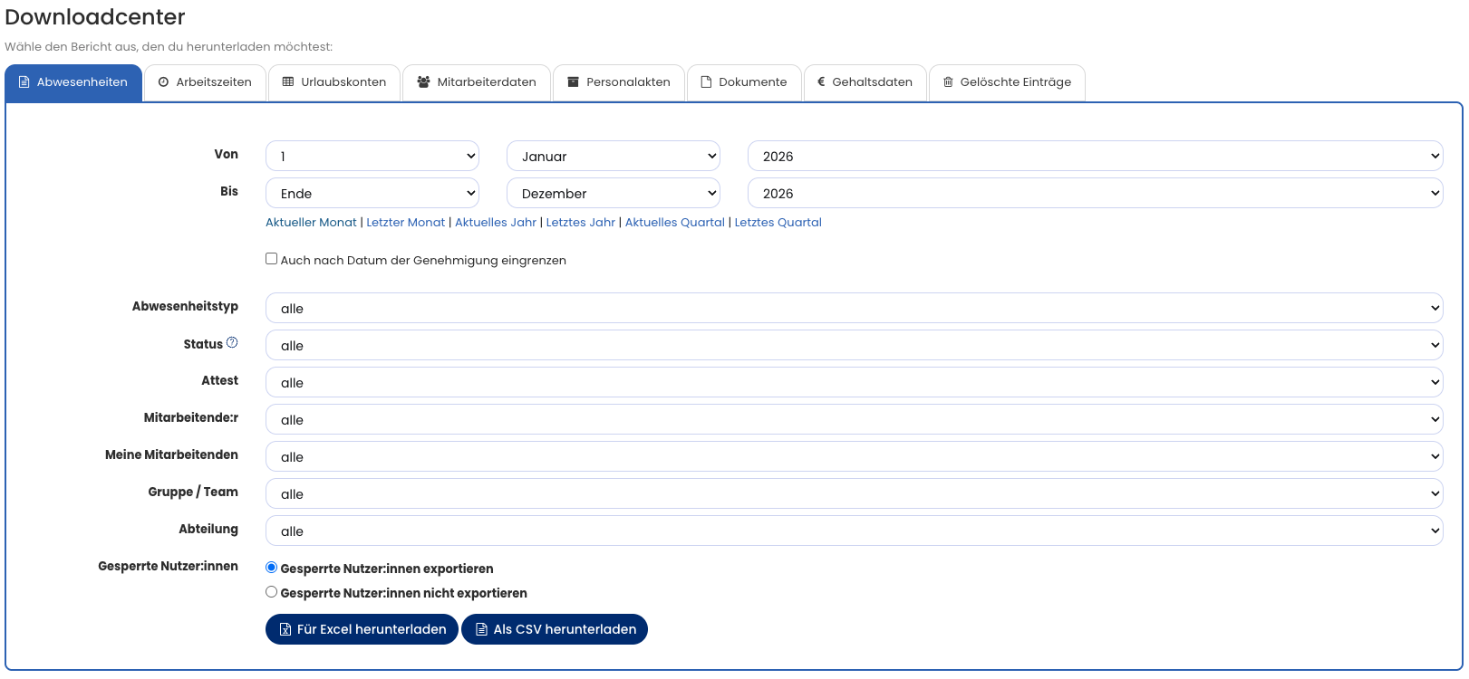 Das Berichtscenter steht Admin-Nutzer:innen immer zur Verfügung. Vorgesetzte Personen können nur darauf zugreifen, wenn Admins den Zugriff freigeschaltet haben. Nutzer:innen mit der Rolle Mitarbeitende haben hingegen keinen Zugriff auf das Berichtscenter.