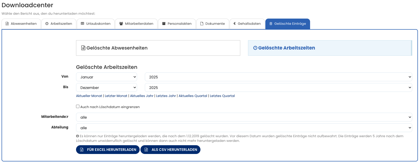 Timebutler protokolliert gelöschte Arbeitszeiteinträge mit Zeitstempel und der Info, wer den Eintrag gelöscht hat. Im Downloadcenter kannst du die gelöschten Arbeitszeiteinträge mit wenigen Klicks als Excel- oder CSV-Datei herunterladen.