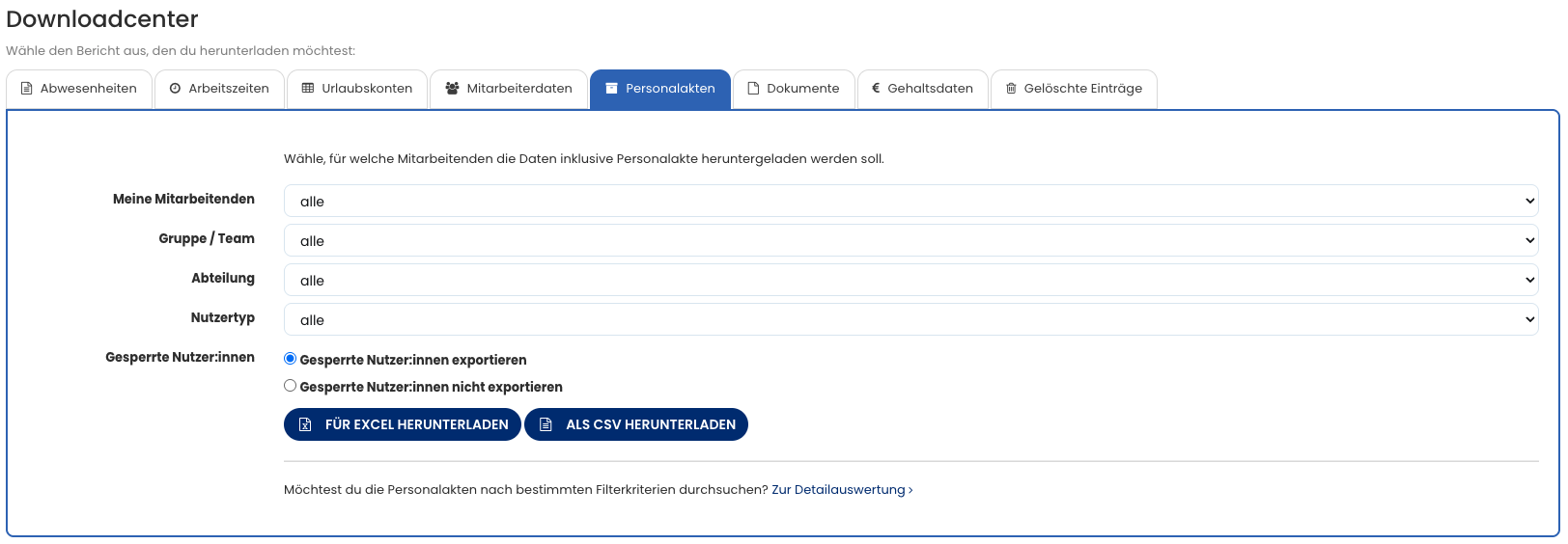 Im Downloadcenter kannst du die Daten aus den Personalakten und die Gehaltsdaten der Mitarbeitenden bequem mit wenigen Klicks als Excel-Datei oder CSV-Datei herunterladen.