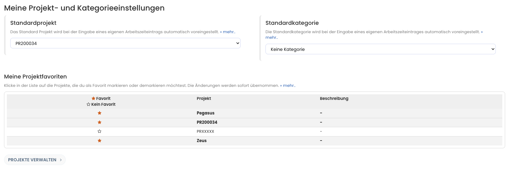 Du kannst persönliche Projektfavoriten festlegen und zusätzlich ein Standardprojekt oder eine Standardkategorie auswählen. Wenn du für ein Projekt oder eine Kategorie einen Standard hinterlegst, wählt Timebutler bei neuen Arbeitszeiteinträgen oder bei der Aufzeichnung über die Stempeluhr das entsprechende Projekt bzw. die entsprechende Kategorie automatisch voraus.