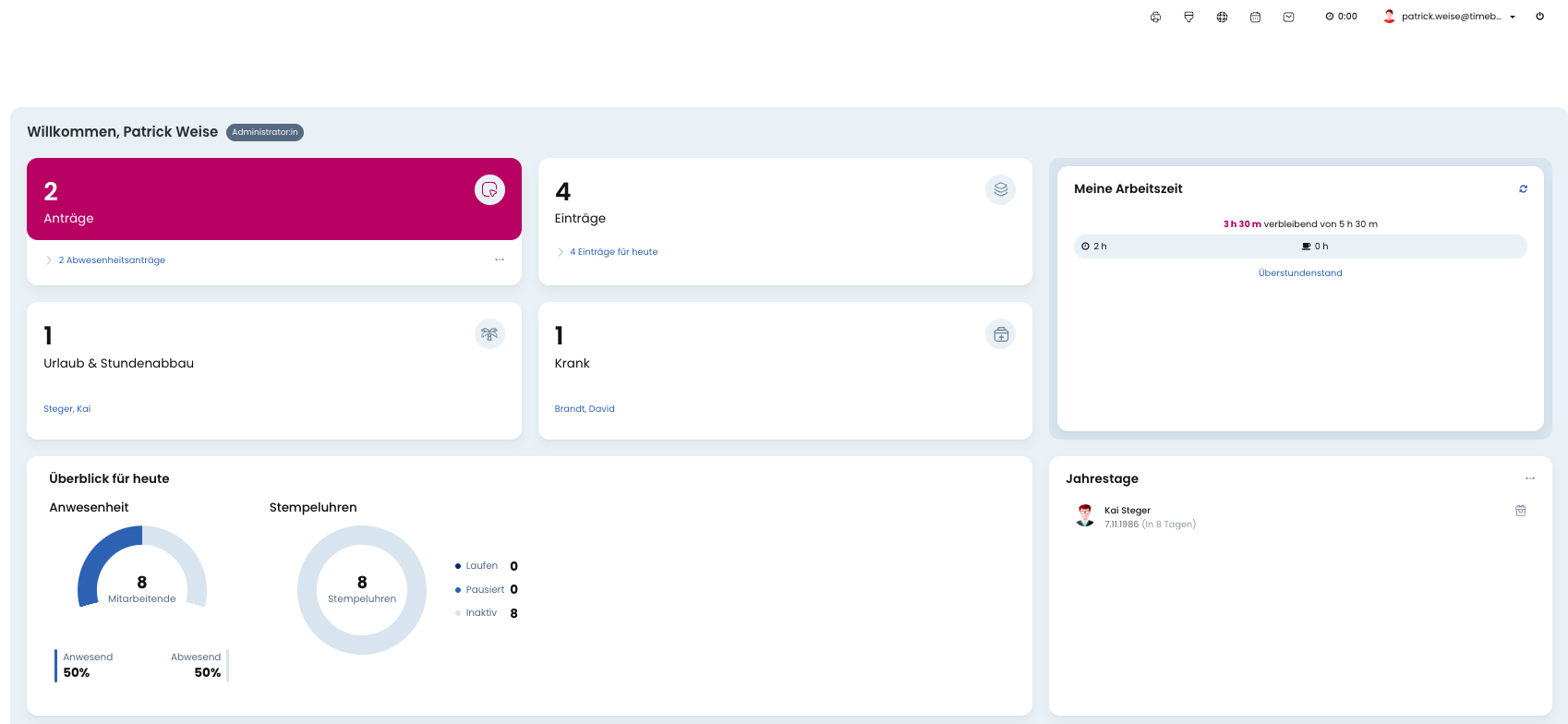Im Dashboard bekommst du Informationen zu offenen Anträgen, anwesenden und abwesenden Mitarbeitenden, anstehenden Geburtstagen und Firmenjubiläen, deinem Arbeitszeitstatus (nur wenn das Zeiterfassungs-Feature aktiviert ist) und vieles mehr.