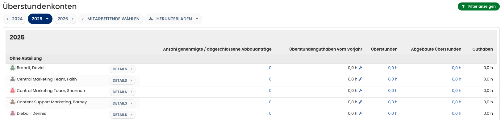 Mit dem Überstunden-Feature gibst du nur die Überstunden und den Überstundenabbau ein, nicht deine vollständigen Arbeitszeiten. Wenn du deine Soll-Arbeitszeit von beispielsweise 8 h geleistet hast, musst du nichts eintragen. Timebutler führt für alle Mitarbeitenden ein Überstundenkonto und rechnet darin Überstunden und Überstundenabbau automatisch ein, zusammen mit dem Überstundenstand vom Vorjahr.