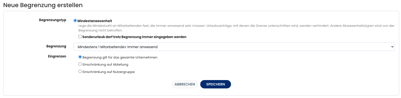 Mit Begrenzungen stellst du sicher, dass eine bestimmte Mindestanzahl an Mitarbeitenden verfügbar ist und nicht zu viele Mitarbeitende aus einer Abteilung oder Nutzer:innengruppe gleichzeitig im Urlaub sind.