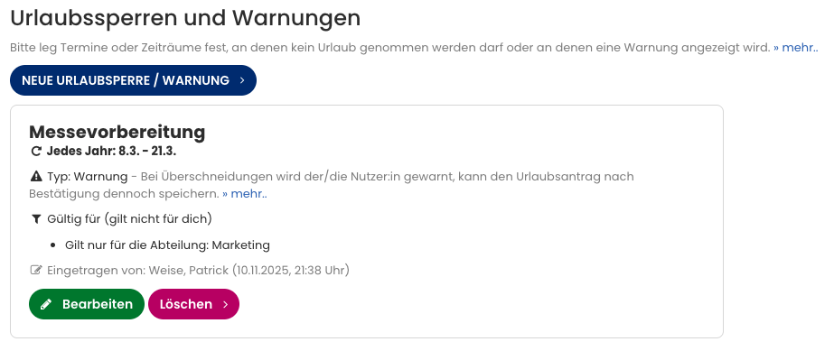 Urlaubssperren und Warnungen bearbeiten