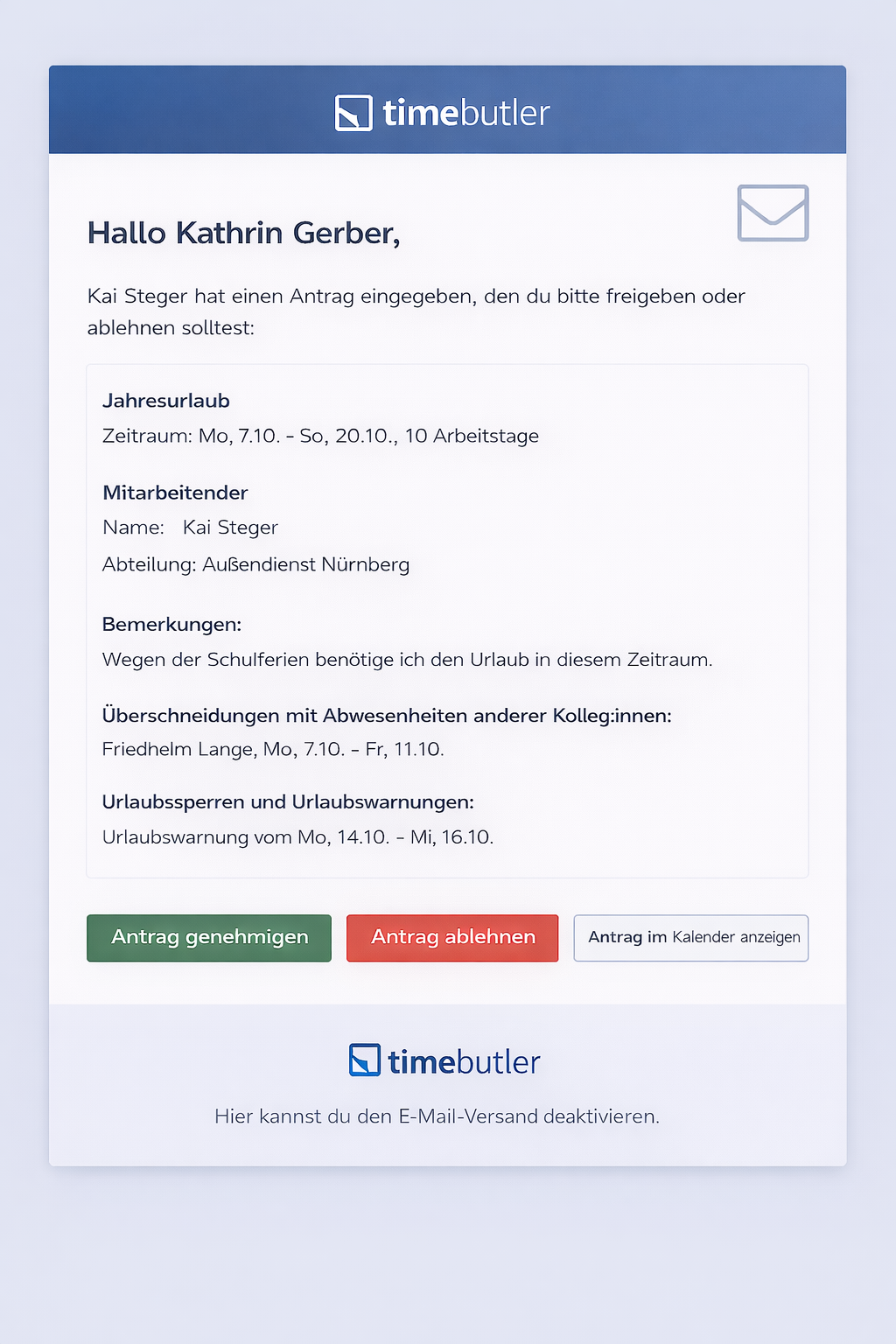 Sobald du Urlaub einträgst, startet Timebutler den Genehmigungs-Workflow. Deine Vorgesetzten werden per E‑Mail über den Urlaubsantrag benachrichtigt. Wenn dir mehrere Vorgesetzte zugeordnet sind, läuft ein mehrstufiger Genehmigungs-Workflow.
