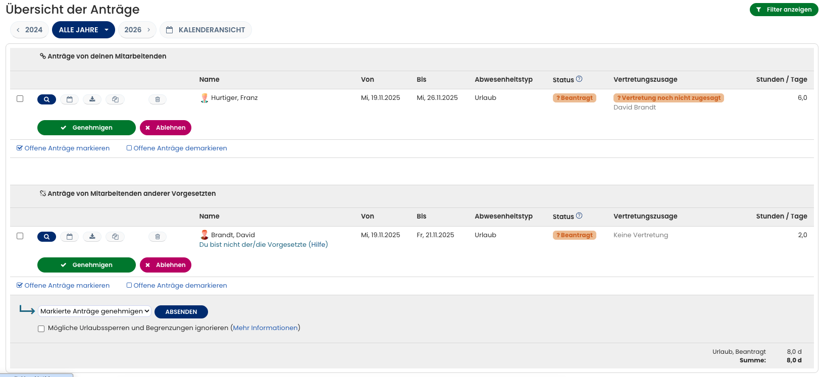Mit der Vertreterfunktion kann die Vertretung während der Abwesenheit von Vorgesetzten Anträge der Mitarbeitenden stellvertretend genehmigen oder ablehnen.