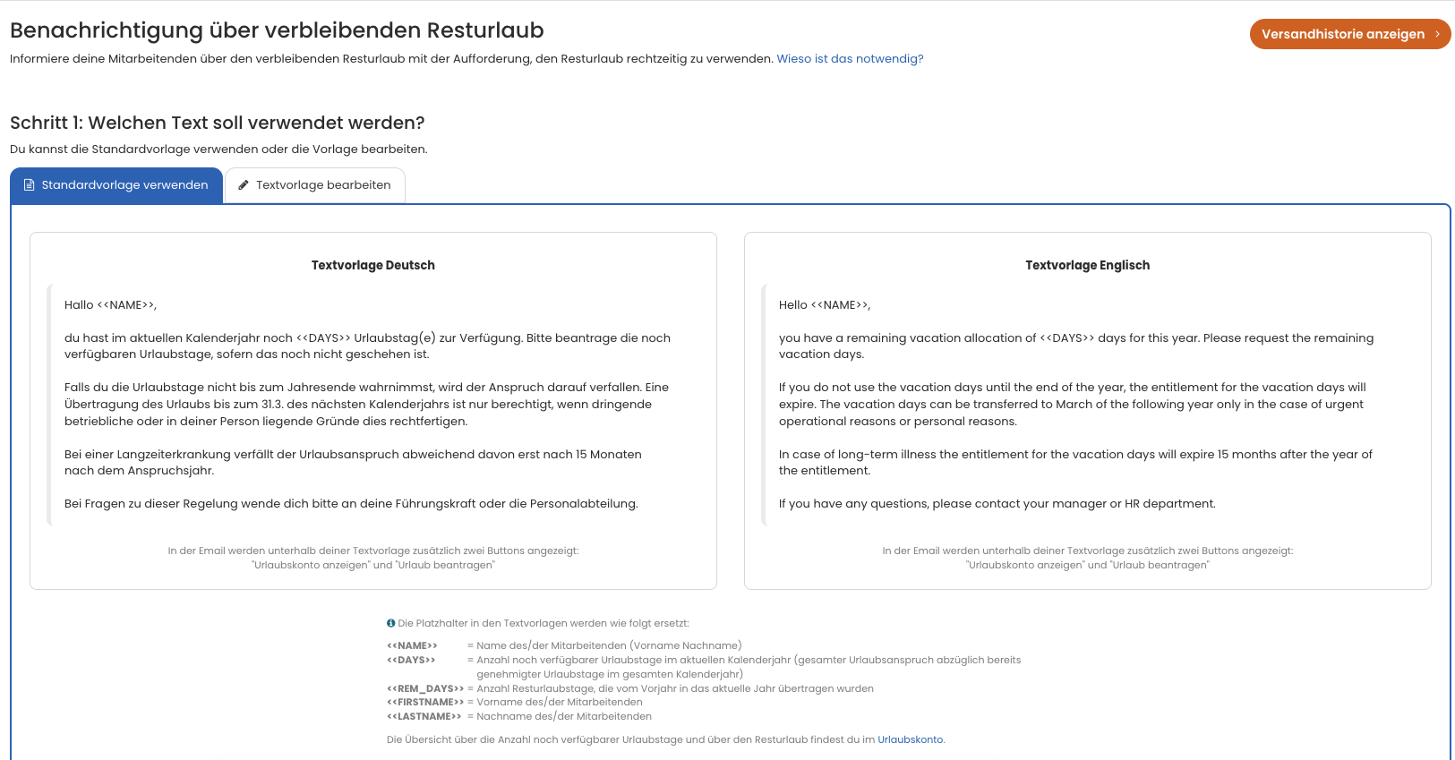 Timebutler stellt eine fertige Textvorlage für die Benachrichtigung bereit. Du kannst die Textvorlage ändern und an deine Bedürfnisse anpassen. In deiner Textvorlage kannst du mehrere Platzhalter verwenden, die von Timebutler automatisch ersetzt werden, z. B. mit dem Namen der/des Mitarbeitenden oder dem individuellen Resturlaubs-Anspruch. Die möglichen Platzhalter sind bei der Bearbeitung der Textvorlage beschrieben.