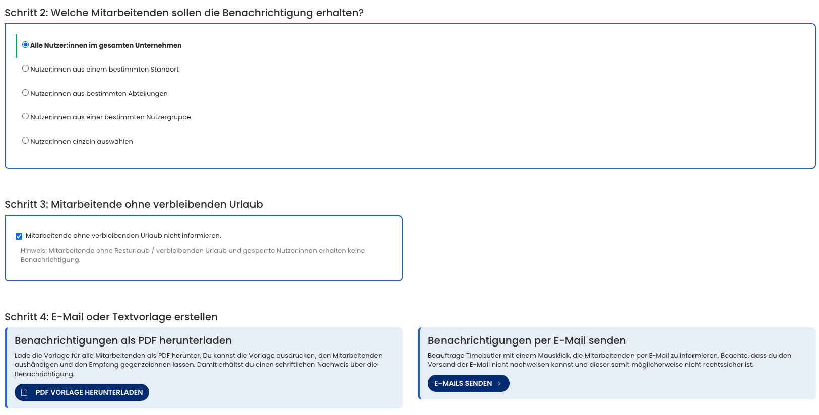 Timebutler protokolliert beim E-Mail-Versand die Namen der Empfänger:innen, die Anzahl der Resturlaubstage und das Datum, an dem du den Versand ausgelöst hast. Bei Unternehmen mit hunderten Mitarbeitenden verschickt Timebutler die E-Mails je nach Unternehmensgröße verteilt über mehrere Stunden, nicht alle gleichzeitig. So sinkt die Wahrscheinlichkeit, dass die E-Mails als Spam aussortiert werden. Timebutler informiert dich über den Versandzeitraum.