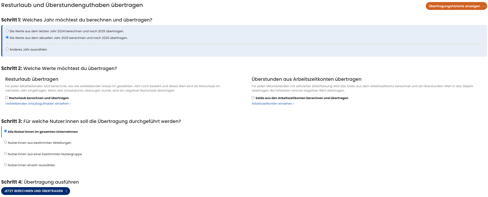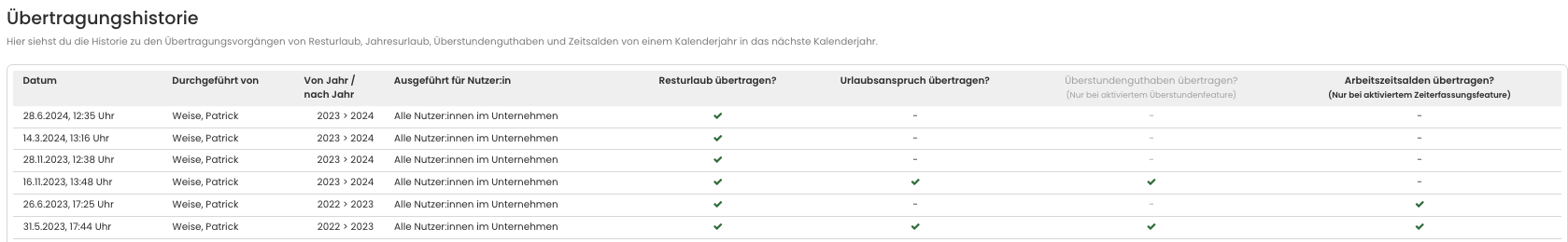 Wir übertragen Resturlaub bewusst nicht automatisch ins nächste Jahr – unter anderem, weil Unternehmen den Resturlaubswert in manchen Fällen manuell anpassen wollen.