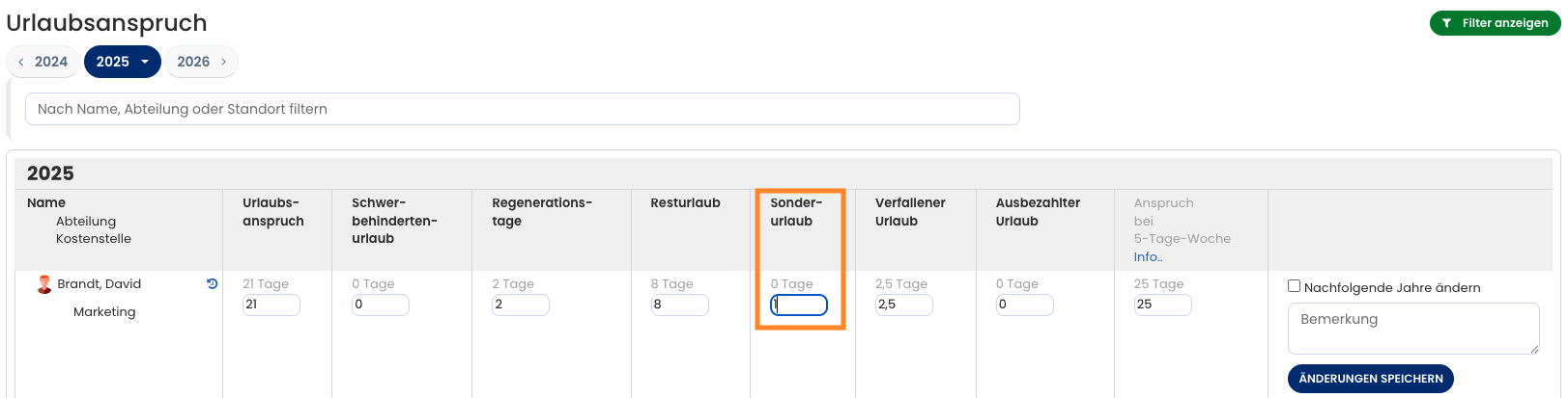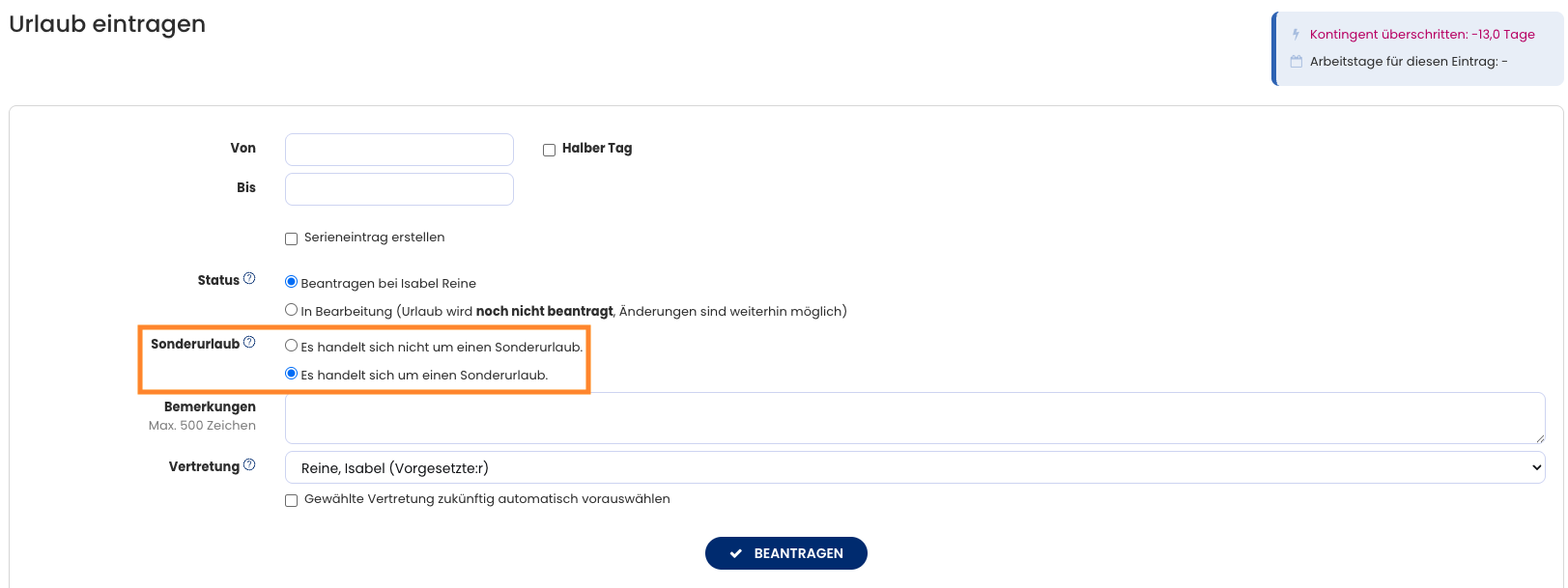 Falls Schritt 2 (Erhöhung des Sonderurlaubsanspruchs durch Admin) vergessen wurde, ist das kein Problem. Du kannst den Anspruch auch nach der Beantragung und Genehmigung des Sonderurlaubs eintragen.