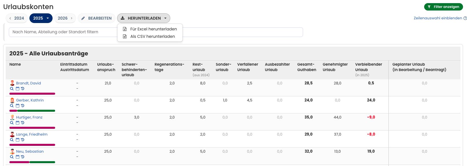 Admin oder Führungskraft kann die Urlaubskonten für mehrere Mitarbeitende öffnen und die Daten als Excel- oder CSV-Datei herunterladen. Dafür gibt es zwei Wege: