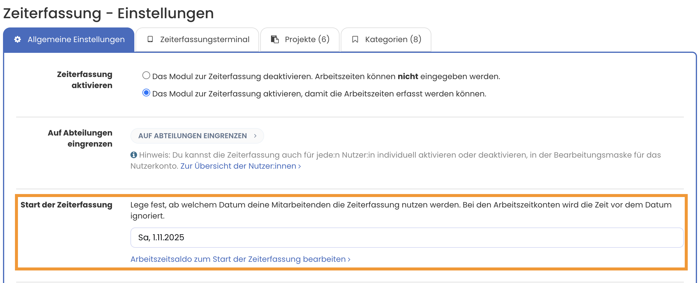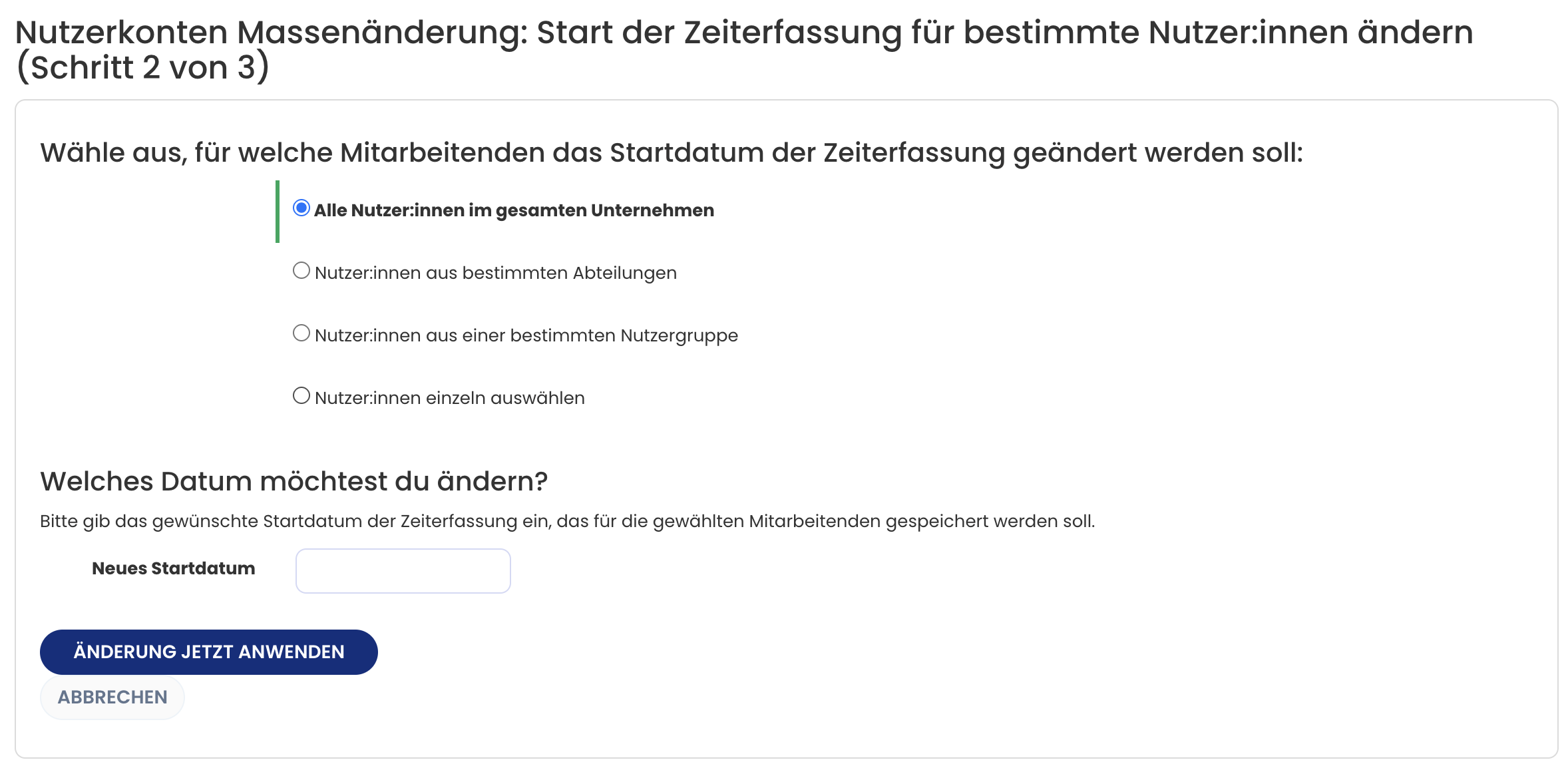 Das hier eingestellte Startdatum gilt für alle Mitarbeitenden, außer für diejenigen, für die im Nutzer:innenkonto ein anderes Startdatum hinterlegt ist (siehe unten).