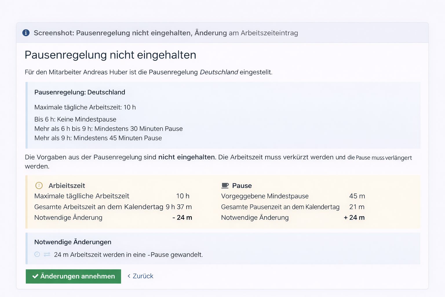 Screenshot: Pausenregelung nicht eingehalten, Änderung am Arbeitszeiteintrag: